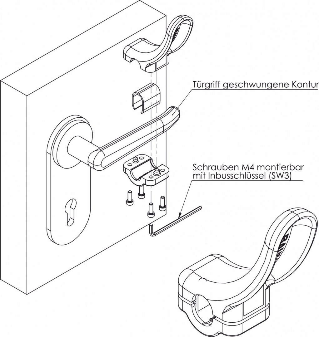 Dieser Türgriff Aufsatz aus einem strapazierfähigen und biokompatiblen Kunststoff ermöglicht ein hygienisches Öffnen und Schließen von Türen ohne Berührung der Türklinke mit den Handflächen. Beim Betätigen der Türklinke durch den Unterarm oder Ellenbogen kann mit Hilfe des Türgriff Aufsatzes die Tür einfach und problemlos aufgezogen werden. Durch den Einsatz dieses Aufsatzes wird die Verbreitung von Keimen, Viren und Bakterien minimiert.
